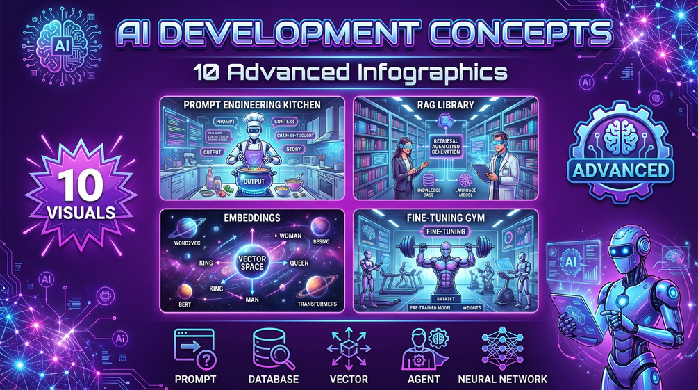 Visual breakdown of 10 essential concepts: prompt engineering, embeddings, fine-tuning, RAG vs vector DBs, agents, and more — explained with color, characters, and clarity.